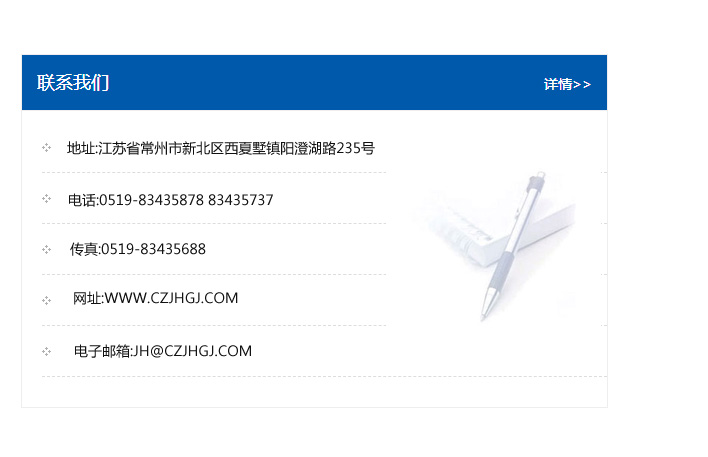 傳真:0519-83435688    郵編:213135    網址:WWW.czjhgj_com.zg-bg.com    電子郵箱:JH@czjhgj_com.zg-bg.com